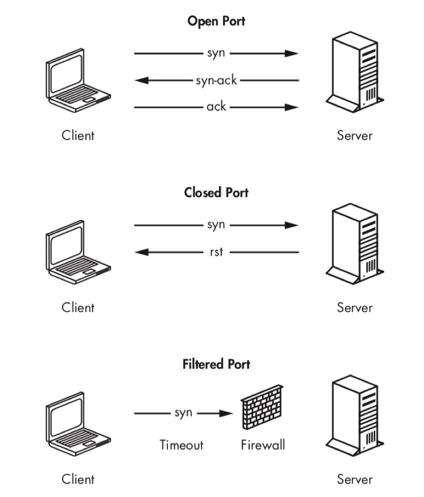复习回顾一下基本知识。图2-1显示了TCP在查询端口以确定端口是开发,关闭还是过滤时如何使用握手过程。